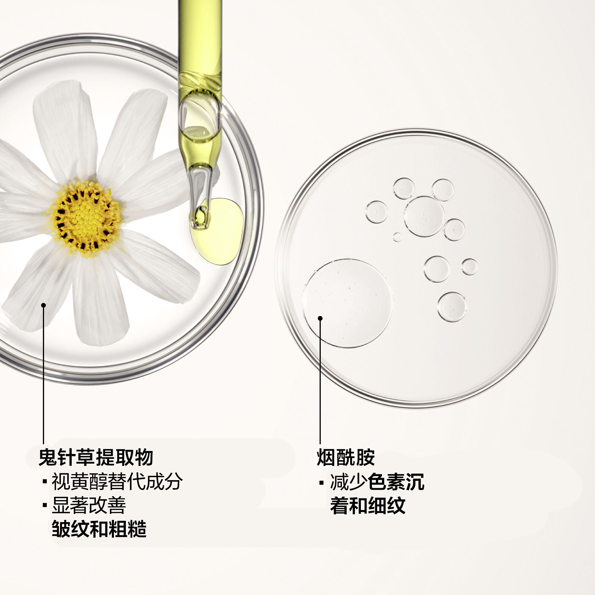 - 鬼针草提取物(植物性视黄醇替代成分)与烟酰胺协同作用,带来强效护肤效果
