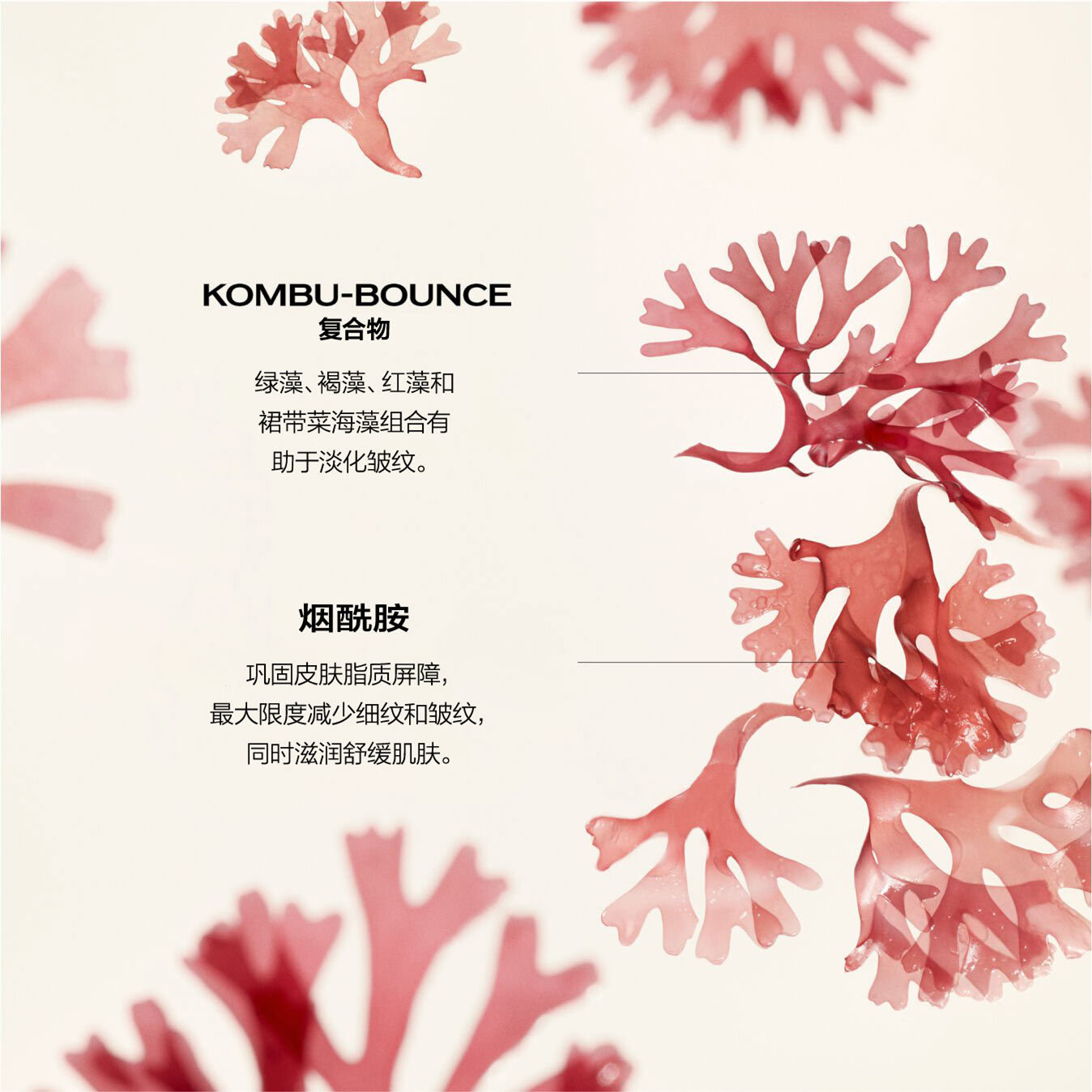- KOMBU-Bounce Complex:绿藻、棕藻和红藻以及小球藻提取物有助于增强肌肤的屏障功能,防止并最大限度地淡化皱纹。