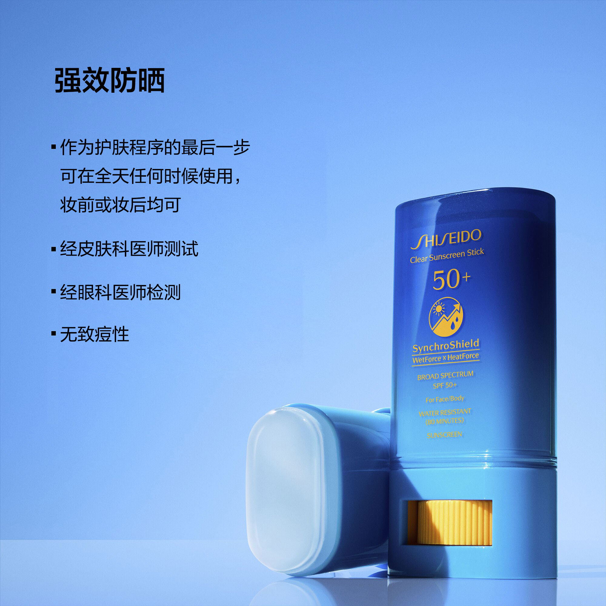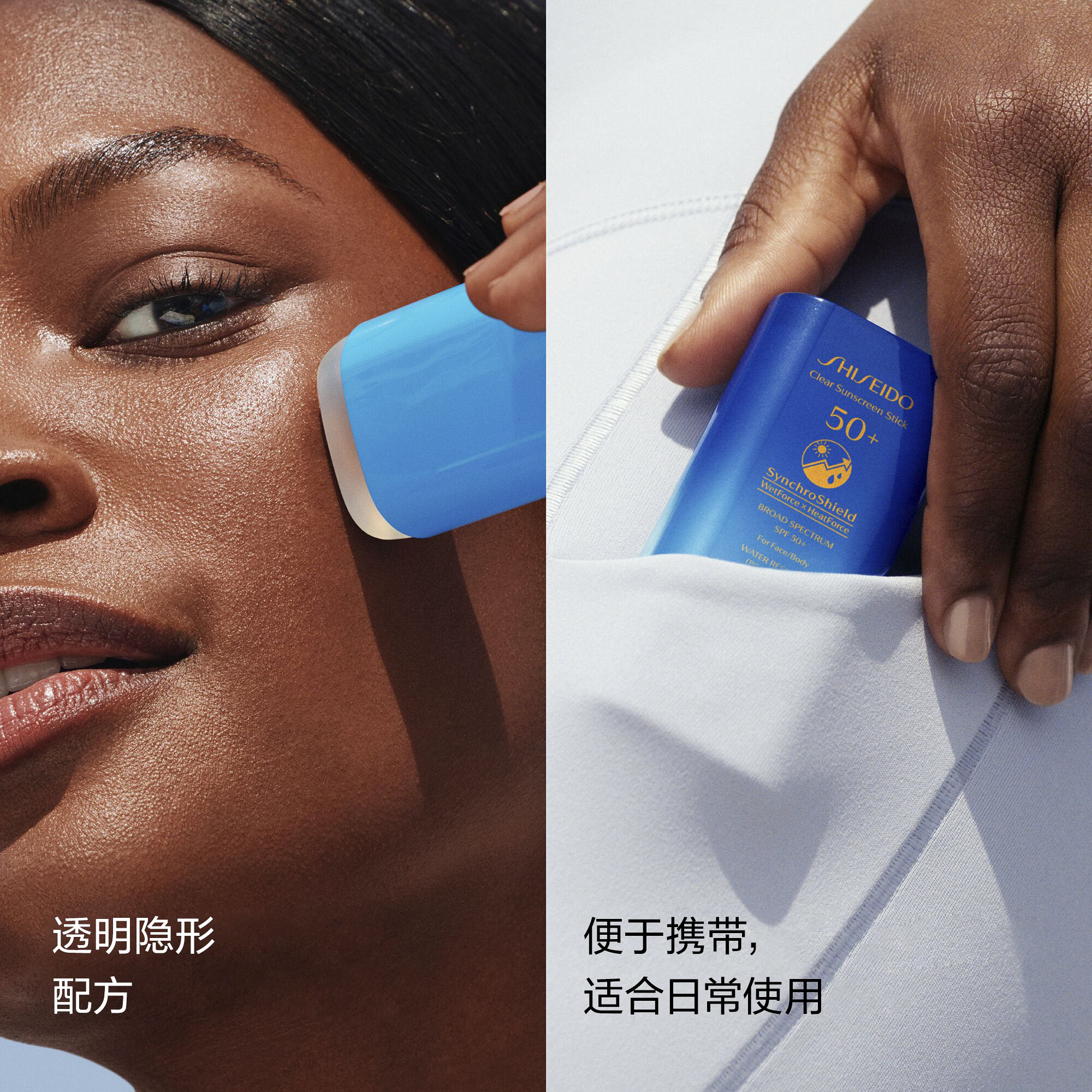 我们备受追捧的Clear Sunscreen Stick SPF 50+是一款方便携带的运动防晒产品。依托于SynchroShield™技术,这种隐形保护膜在感应到水和热*时会发挥更强大的功效,从而在运动和户外活动中提供最佳防护。这款通透、无残留的面部和身体日常防晒霜含有大豆卵磷脂和甘草提取物等天然护肤成分,可防止皱纹、色斑和暗沉。**