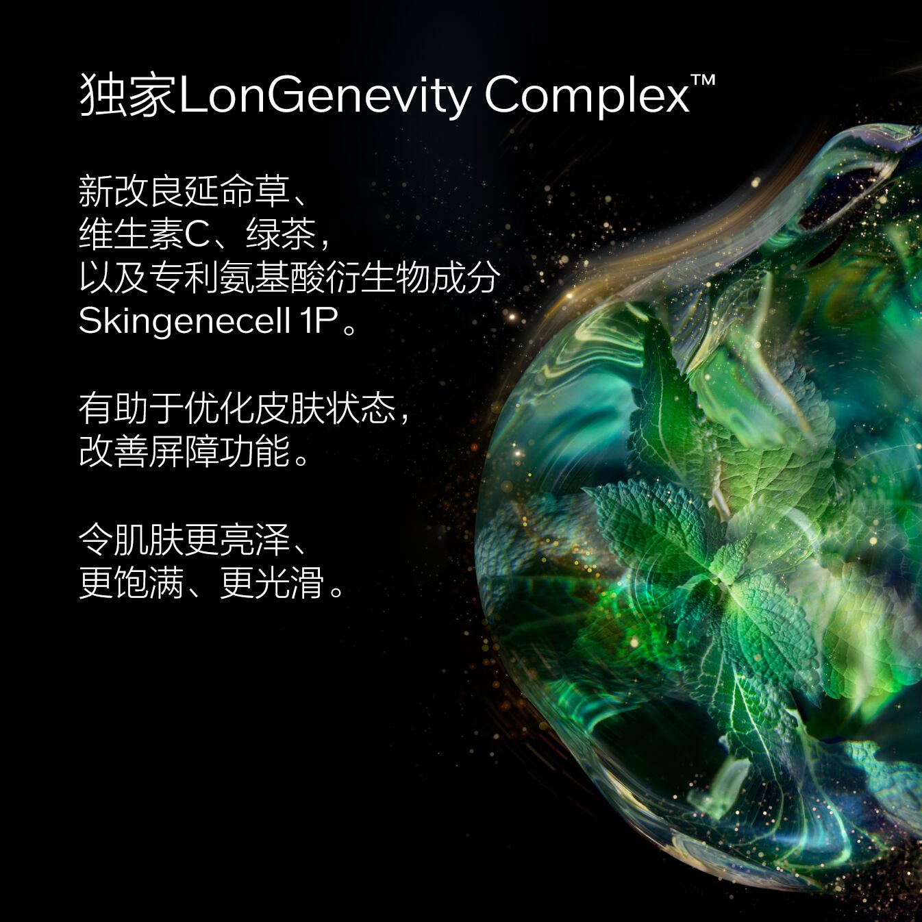 融合我们专有的LonGenevity Complex™配方,蕴含经强化延命草、维生素C、绿茶提取物以及Skingenecell 1P——一种独特的氨基酸衍生物,为肌肤注入活力。这款高效配方有助于强化皮肤屏障功能,使皮肤更加亮泽、丰盈、光滑。